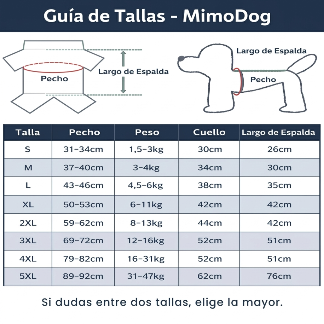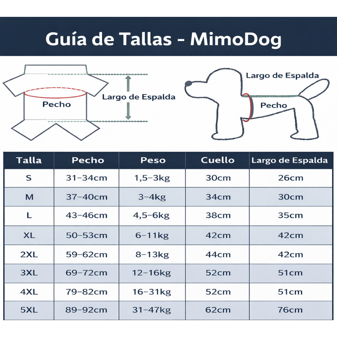 Recomendamos medir el pecho, cuello y largo de tu peludo y consultar nuestra guía de tallas para asegurar un ajuste cómodo y seguro.